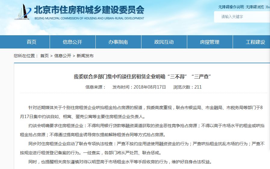 17日,北京市住建委发文表示:我委高度重视,联合市银监局、市金融局、市税务局等部门于8月17日集中约谈自如、相寓、蛋壳公寓等主要住房租赁企业负责人。